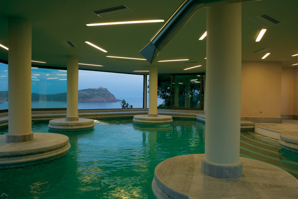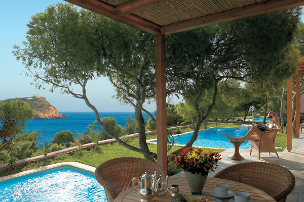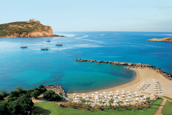 Роскошные виллы и бунгало отеля расположены на Афинском Побережье, в 38 км от Афинского аэропорта, в 60 км от центра Афин, на территории национального парка. Отель находится среди сосновой рощи, на живописном холме, спускающемся к прозрачным водам моря, в которых отражается величественный храм Посейдона. В отеле: открытый подогреваемый бассейн, джакузи, крытый гидро-тонизирующий бассейн «Аква-Эликсир», 3 освещаемых теннисных корта, футбольное поле, водные виды спорта, морские круизы на яхте, рыбалка, центр SPA, сауна, тренажерный зал, салон красоты, парикмахерская, бар, зона отдыха, процедурные кабинеты, массаж, ванны, 6 залов для конференций и банкетов, бизнес–центр, библиотека CD/DVD дисков, бутики, парковка, вертолетная площадка, аренда автомобилей и яхт, услуги прачечной и химчистки. Для детей: детский бассейн, игровая площадка, детский клуб.