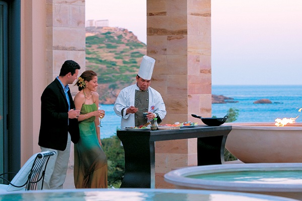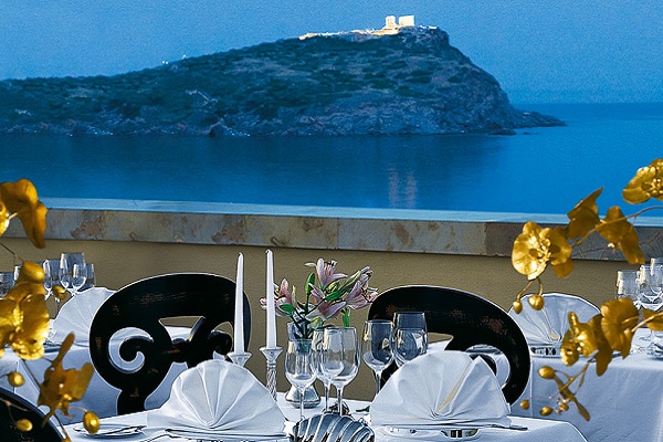 Ресторане Cape Sounio - греческая и интернациональная кухни. The Restaurant – ресторан a la carte - эксклюзивные блюда, греческой, итальянской и французской кухонь. Ресторан Cavo Kolones - захватывающий вид на храм Посейдона - критская кухня. Ресторан So Oriental - азиатская кухня. Aegean Grill – ресторан и бар у бассейна - основные блюда, салаты, десерты и различные напитки. Yali – средиземноморская кухня, деликатесы из морепродуктов, изысканные напитки и коктейли. Элегантный Lounge Bar - фирменные коктейли и легкие закуски. Предлагается частное обслуживание, организация тематических и частных ужинов, обслуживание в номерах.