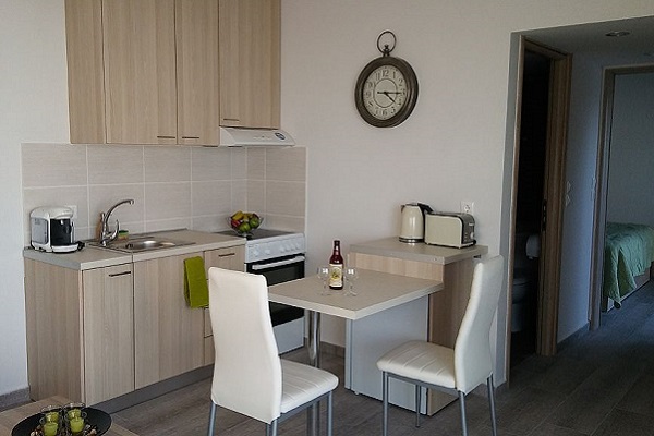 В каждых апартаментах: небольшая кухня с холодильником, керамической плитой с духовкой, чайник, кофеварка с фильтром, тостер, фен, утюг, сейф, спутниковое телевидение, интернет. Уборка и смена постельного белья.