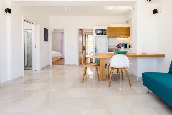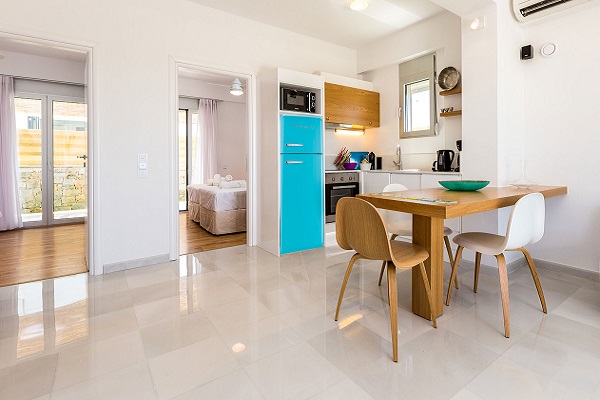 Внутренняя планировка - при входе на виллу - большая гостиная со спутниковым телевидением высокой четкости и Nintendo Wii и обеденной зоной, полностью оборудованная кухня с высококачественной техникой. Стеклянные двери до пола ведут на веранду, которая объединяет гостиную с бассейном и садом. Пройдя по коридору, Вы увидите две спальни: одна с двуспальной кроватью размера «king-size», а другая с 2 односпальными кроватями, которые при необходимости могут быть преобразованы в двуспальную. В конце коридора находится ванная комната с гидромассажной душевой кабиной и туалетными принадлежностями Apivita и Cocomat.