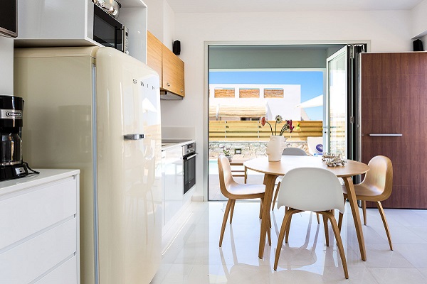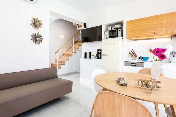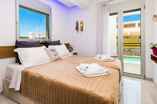 Внутренняя планировка - при входе на виллу - большая гостиная со спутниковым телевидением высокой четкости и Nintendo Wii и обеденной зоной, полностью оборудованная кухня с высококачественной техникой. Стеклянные двери до пола ведут на веранду, которая объединяет гостиную с бассейном и садом. На этом же этаже находится ванная комната с душем и 2 спальни с 2 односпальными кроватями, которые при необходимости могут быть трансформированы в двуспальную. На втором этаже находится еще одна спальня с большой двуспальной кроватью и главная ванная комната с джакузи, с туалетными принадлежностями Apivita и Cocomat.